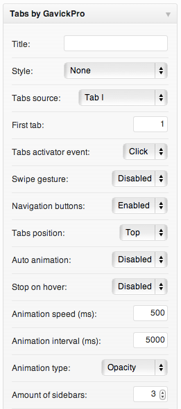 The most important option is the Tabs source - this option specifies the sidebar used as the data source of the widget. When Tabs plugin is active three special widget areas are created – GK Tab I, GK Tab II and GK Tab III – these widget areas don’t exist on the theme and they can be used in the GK Tabs widget to avoid problems with the duplicated widgets.